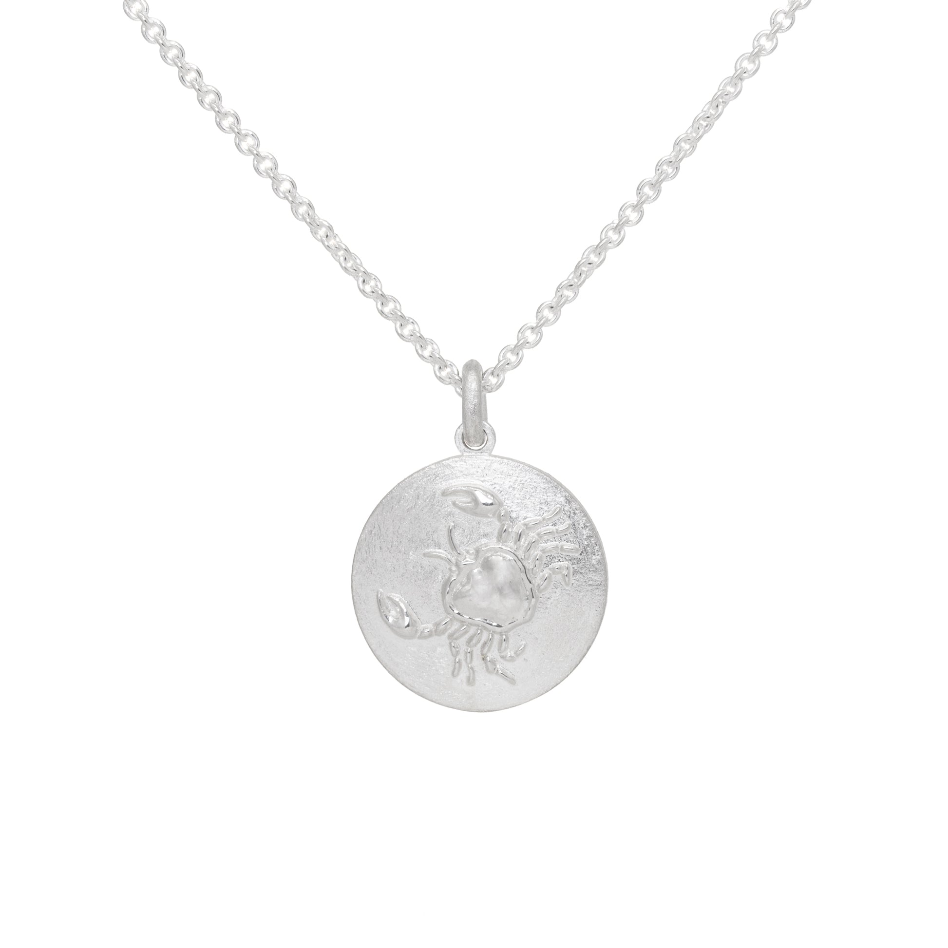 This sterling silver Cancer Zodiac pendant is approximately 19.5mm in diameter. It has been made using recycled sterling silver and comes on an 18 inch sterling silver chain fastened with a lobster clasp.
