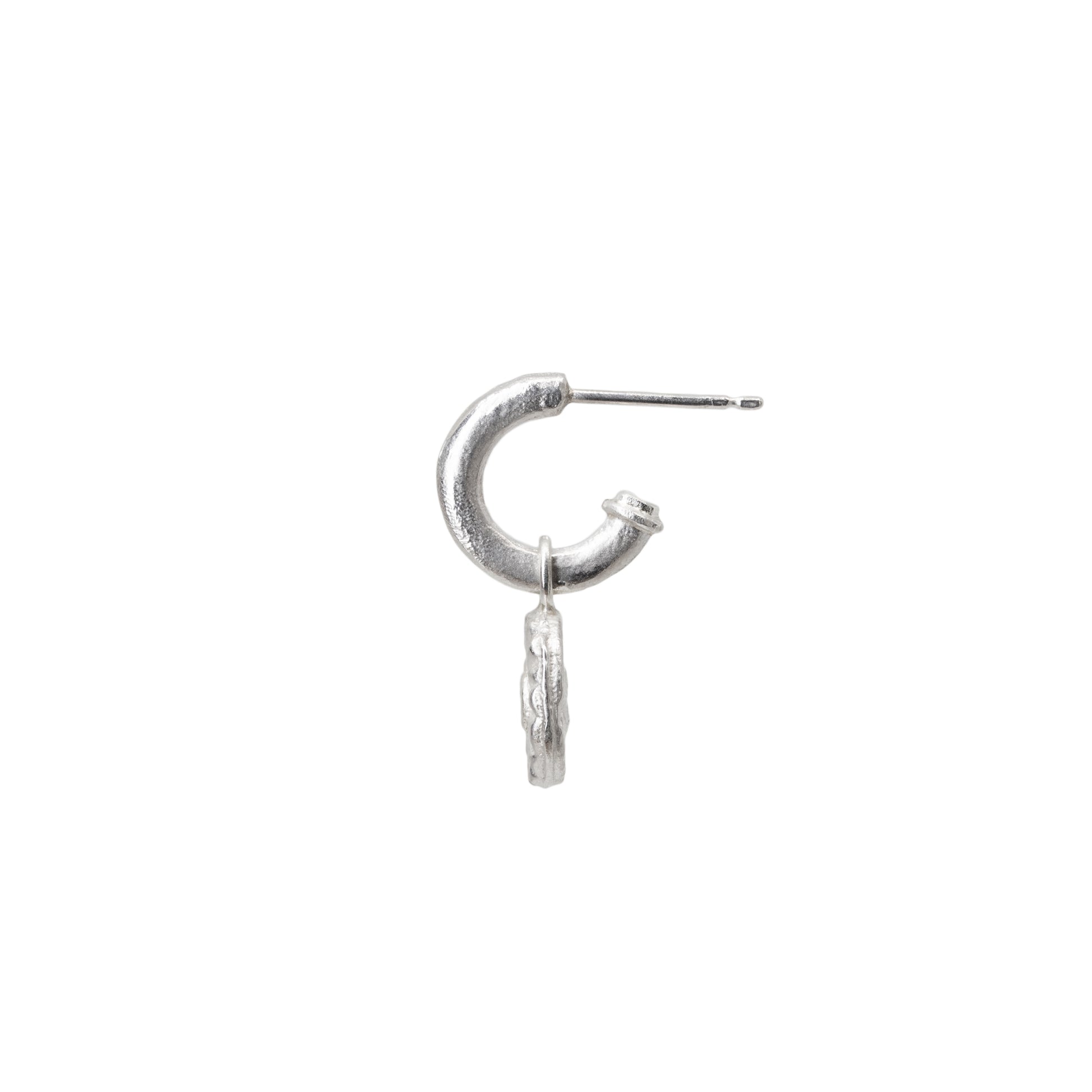 These hoop earrings are a one-of-a-kind design. They have been sandcast using recycled sterling silver and feature 2mm lab grown diamonds. The diamond settings can be removed and the hoops can be worn on their own.